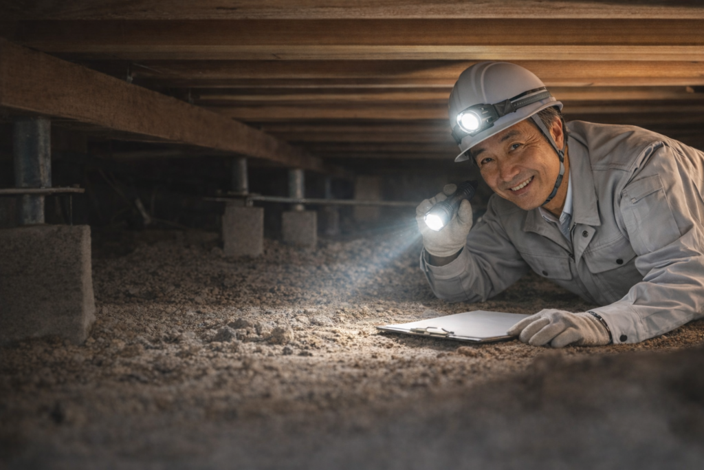 【床下調査】 シロアリの被害、木材の腐朽(腐り)、基礎のひび割れ、湿気の状態などを確認します。